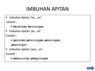 Contoh imbuhan serapan -man -wan -wati. Ramli membasuh pakaian di dobi. Imbuhan apitan ialah imbuhan yang ditambahkan serentak pada hadapan dan pada belakang kata dasar.